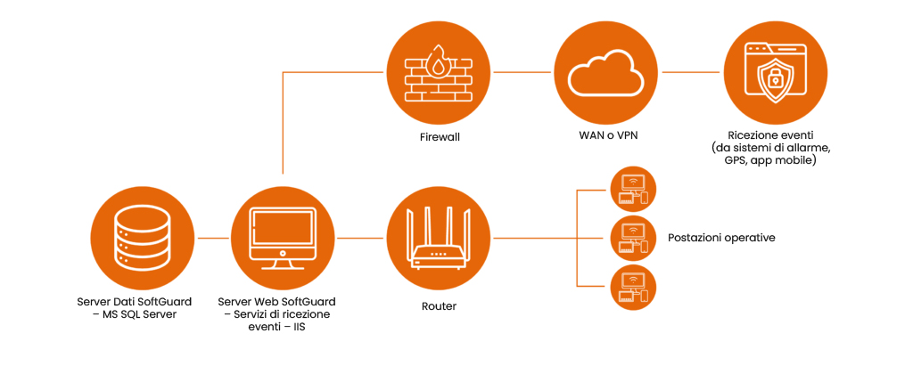 SoftGuard offre opzioni di implementazione versatili, consentendo l’installazione on-premise o in cloud. Il sistema di monitoraggio è accessibile tramite browser web standard come Chrome, IE, Firefox e Safari, rendendolo al 100% web-based per le postazioni operative.