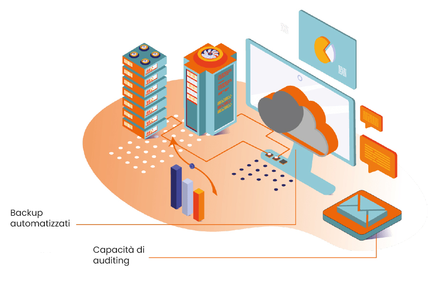 Mentre l’infrastruttura e l’ambiente in cui la piattaforma è implementata sono gestiti dalla banca, la piattaforma SoftGuard stessa integra diverse funzionalità di sicurezza, come backup automatizzati e capacità di auditing, fornendo un ulteriore livello di sicurezza e responsabilità.